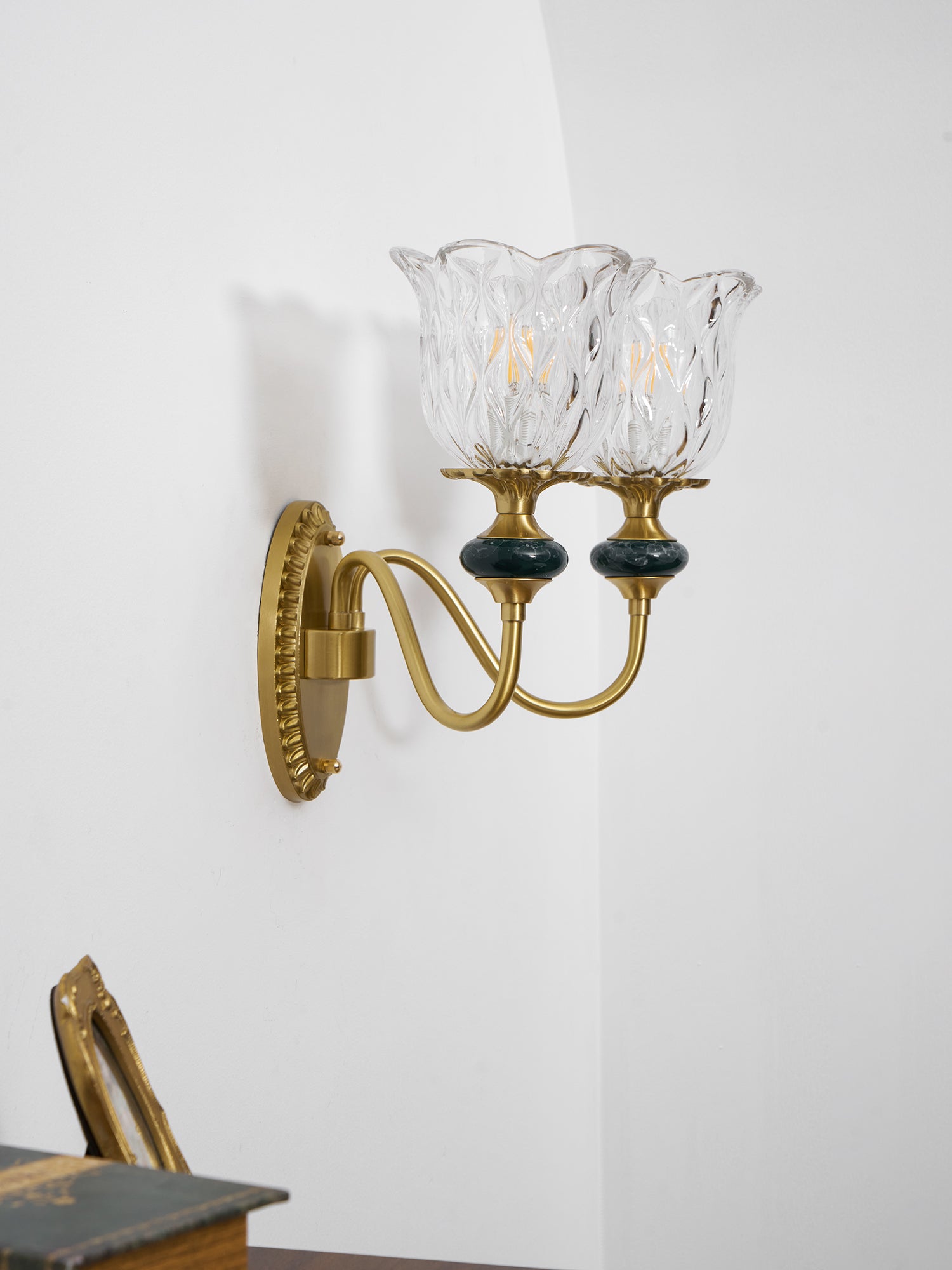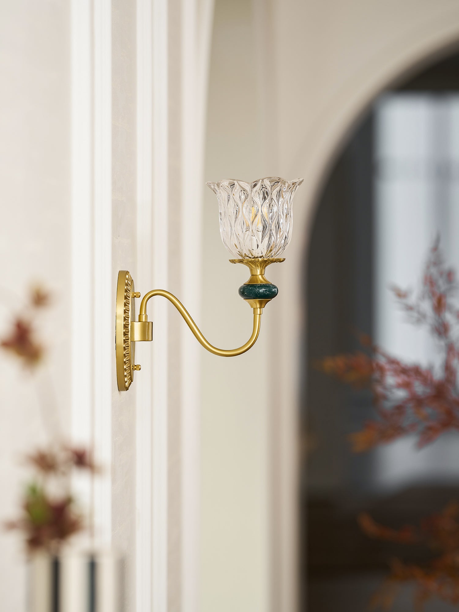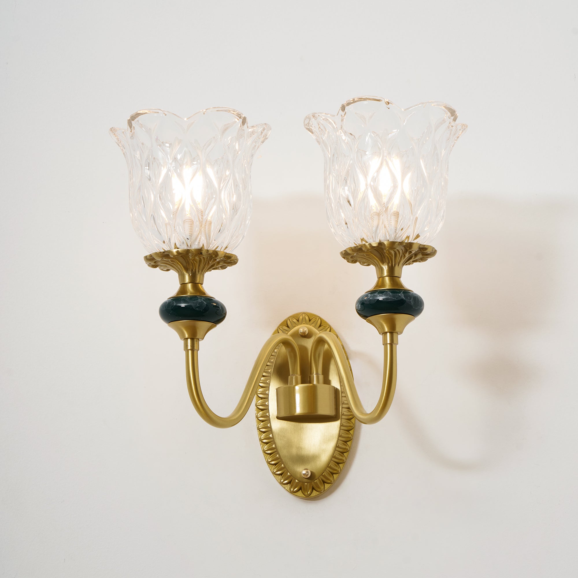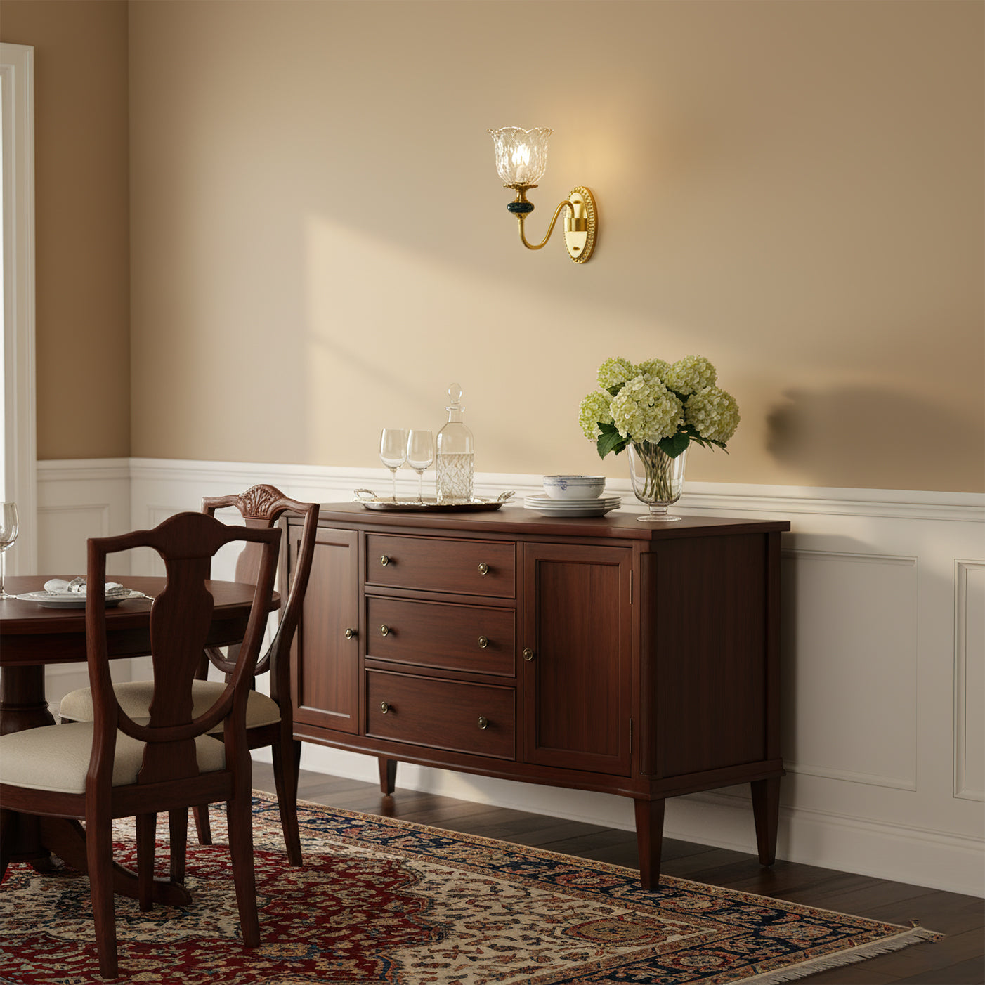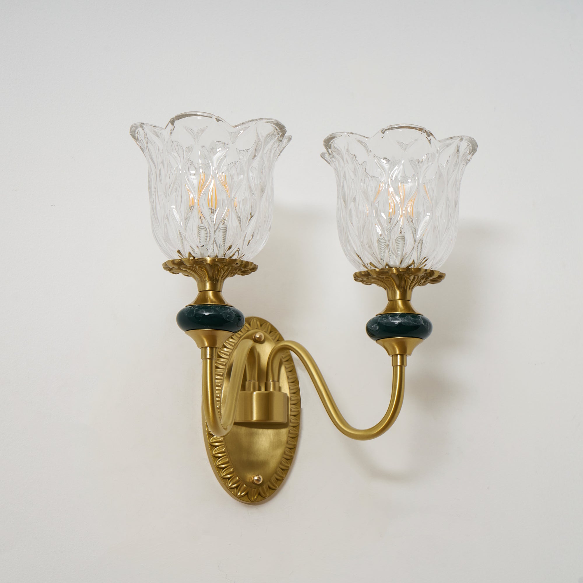 يتم تعريف مصباح الحائط هذا من خلال الذراع المنحني واللوح الخلفي البيضاوي المنحوت، مع زخرفة سيراميك زرقاء. هذا التصميم مزخرف وبسيط، وهو تقليدي الطراز.