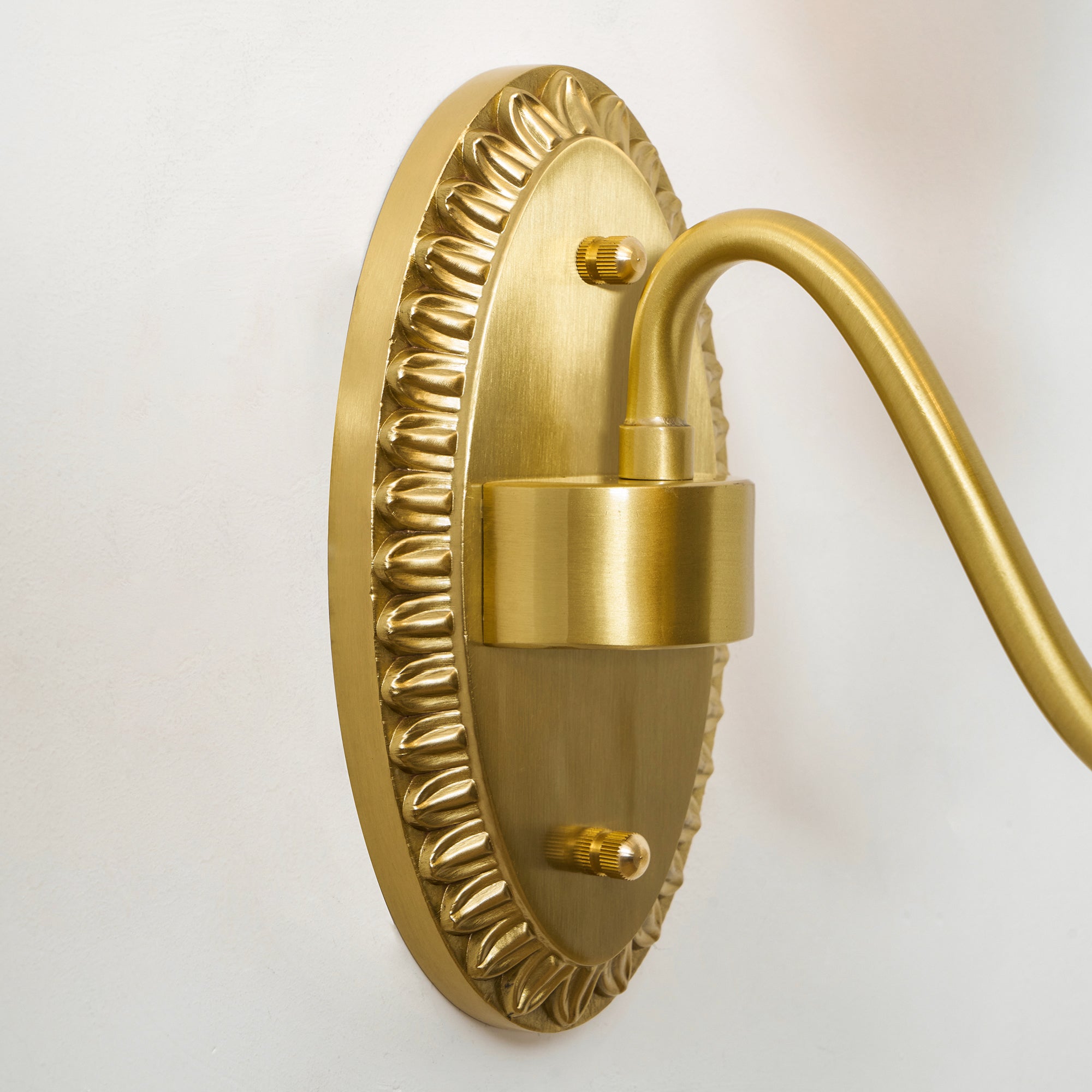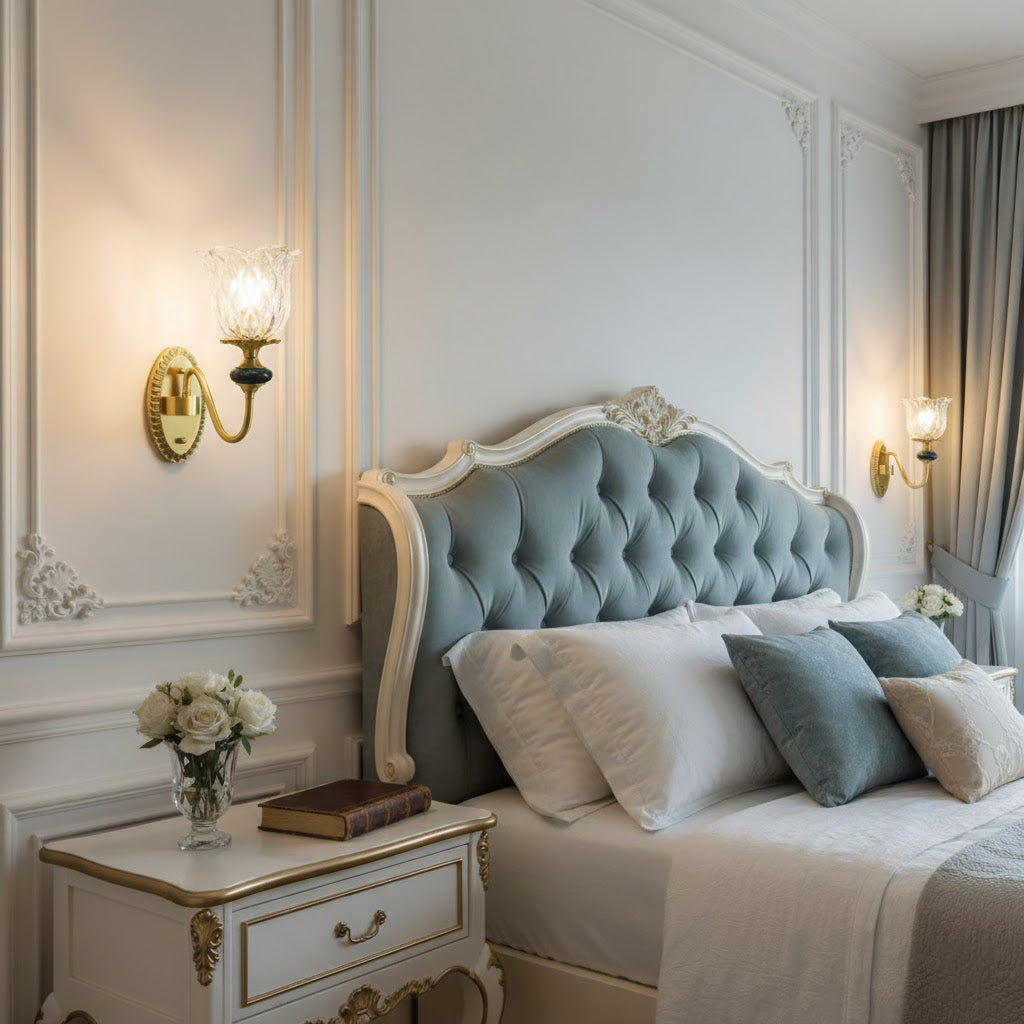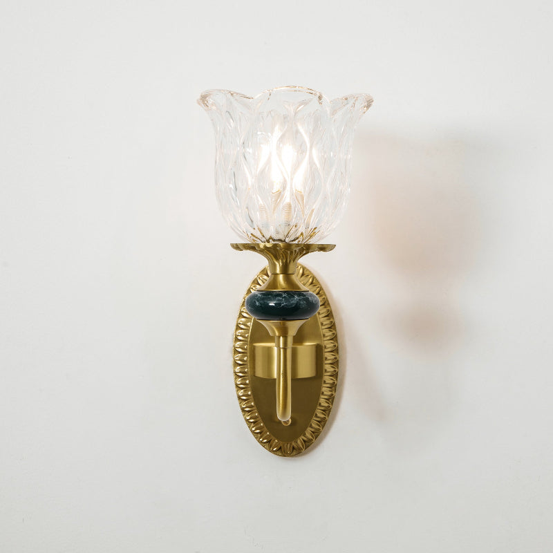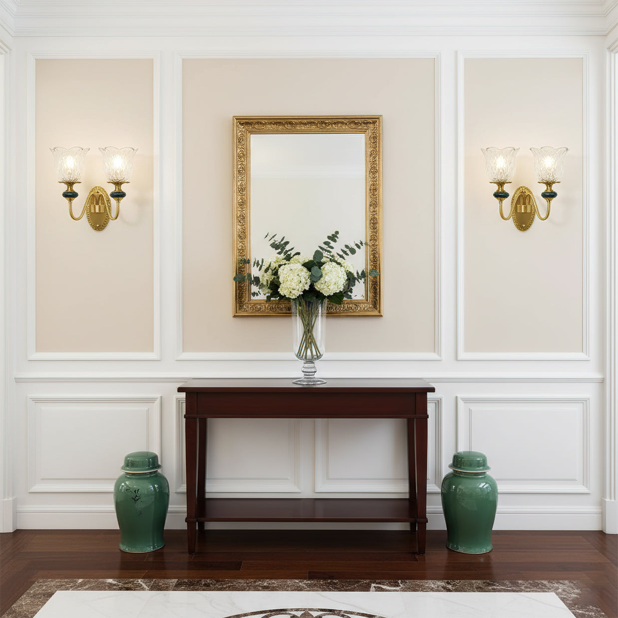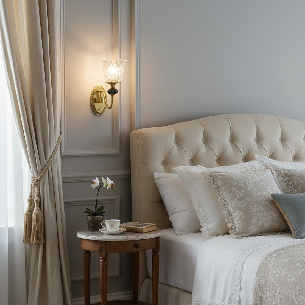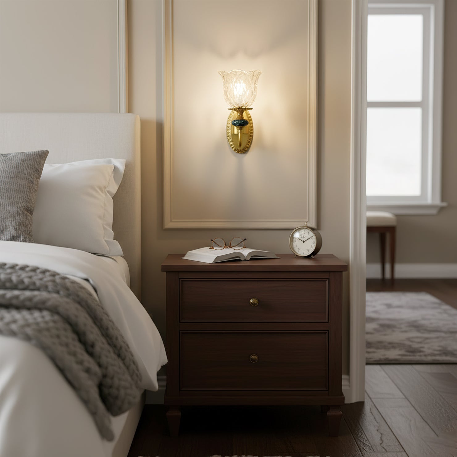 يتم تعريف مصباح الحائط هذا من خلال الذراع المنحني واللوح الخلفي البيضاوي المنحوت، مع زخرفة سيراميك زرقاء. هذا التصميم مزخرف وبسيط، وهو تقليدي الطراز.