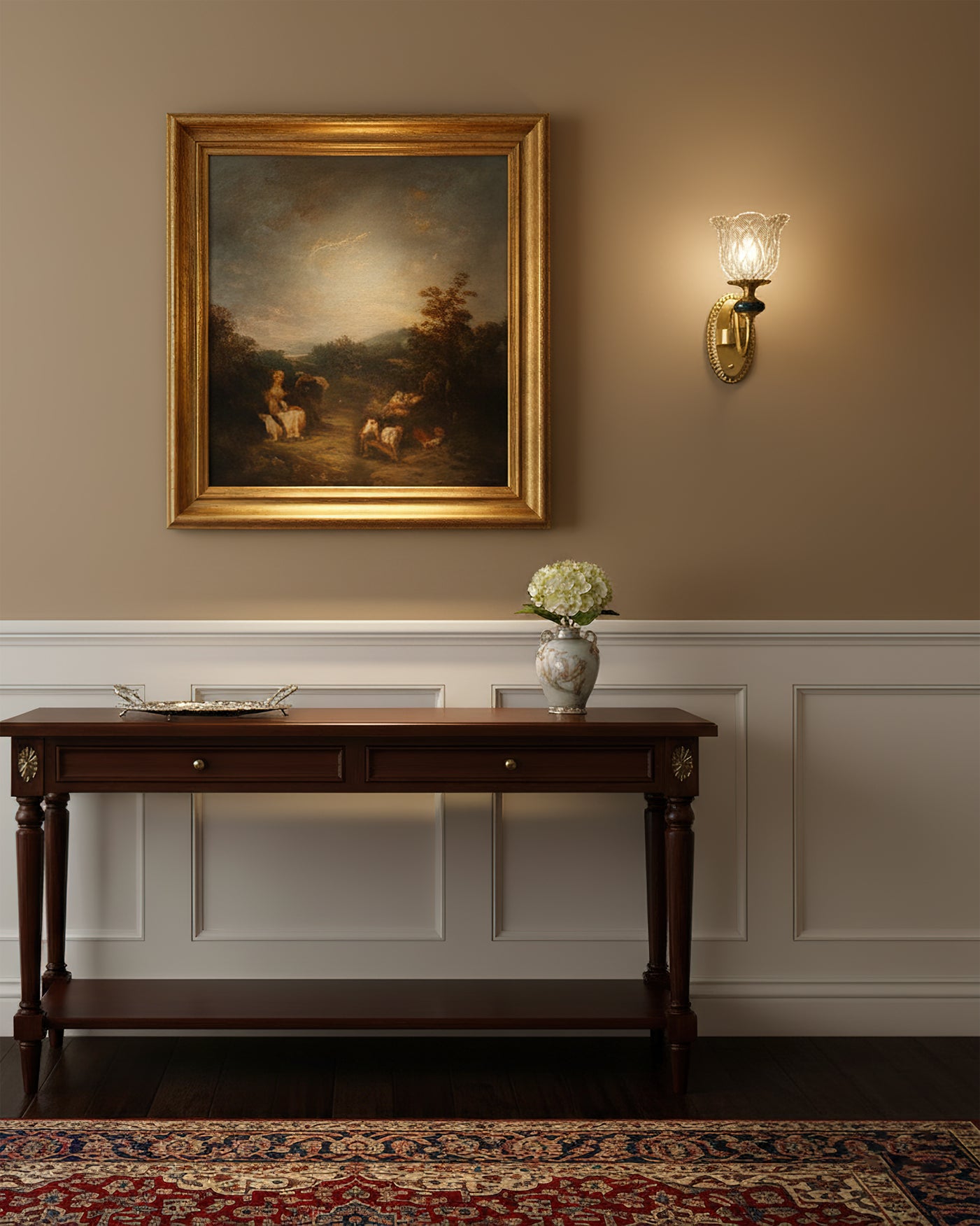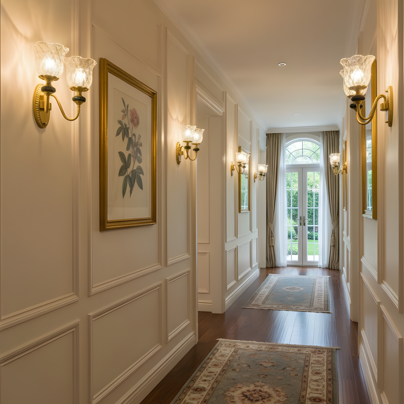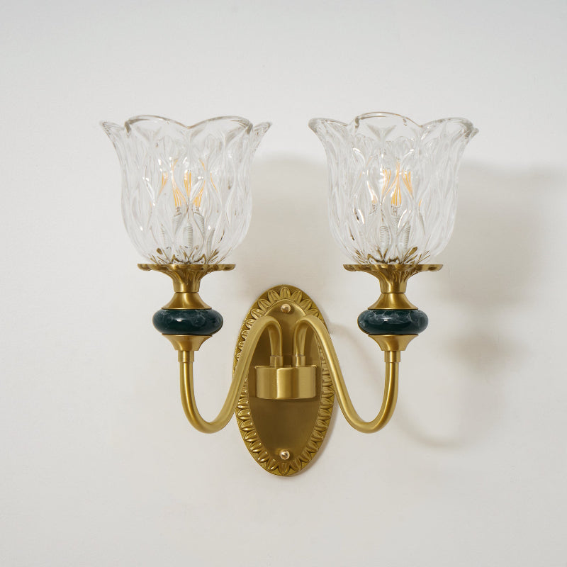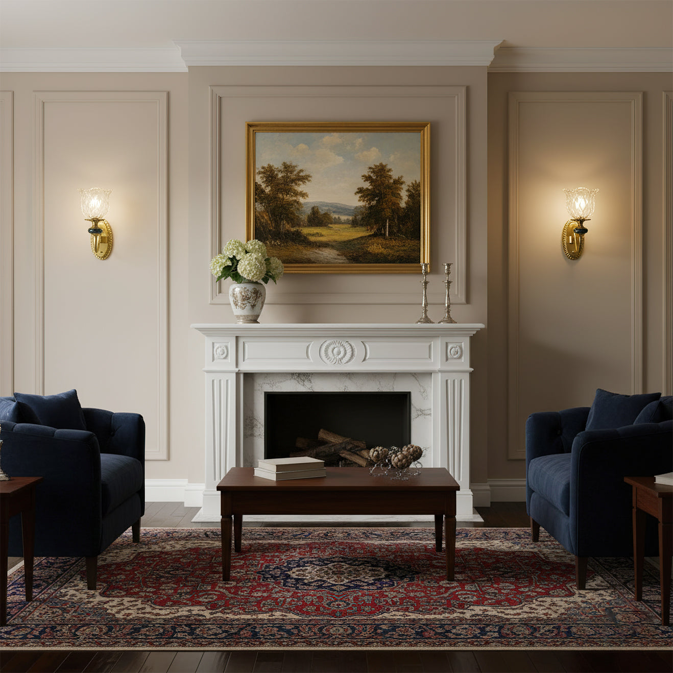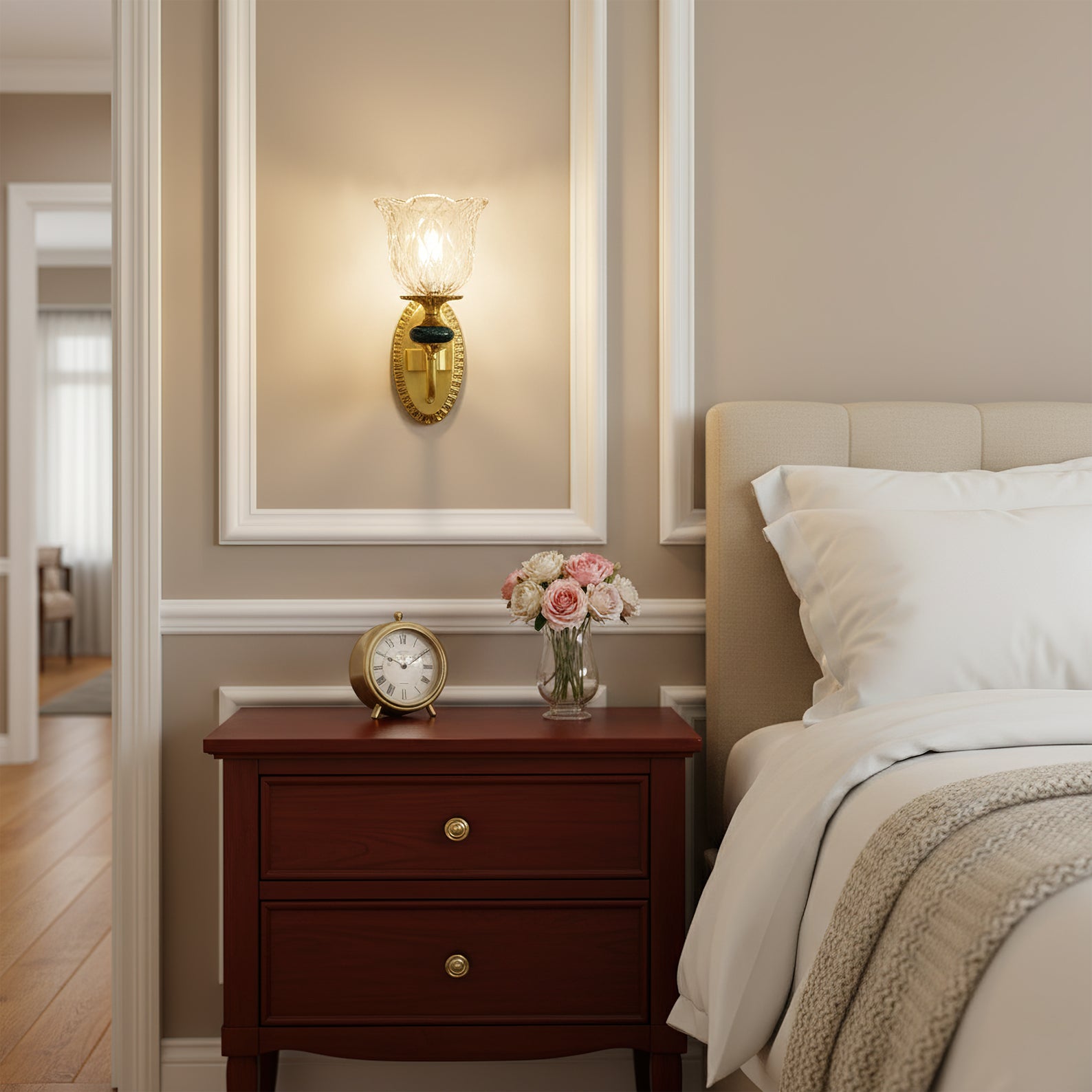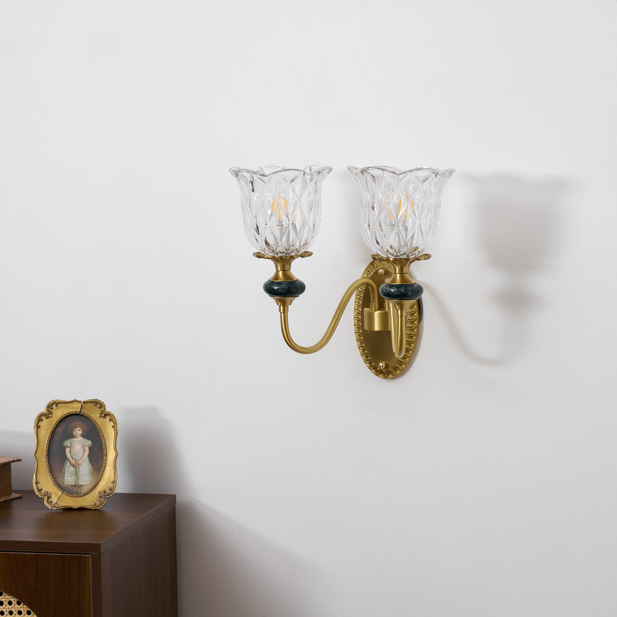يتم تعريف مصباح الحائط هذا من خلال الذراع المنحني واللوح الخلفي البيضاوي المنحوت، مع زخرفة سيراميك زرقاء. هذا التصميم مزخرف وبسيط، وهو تقليدي الطراز.