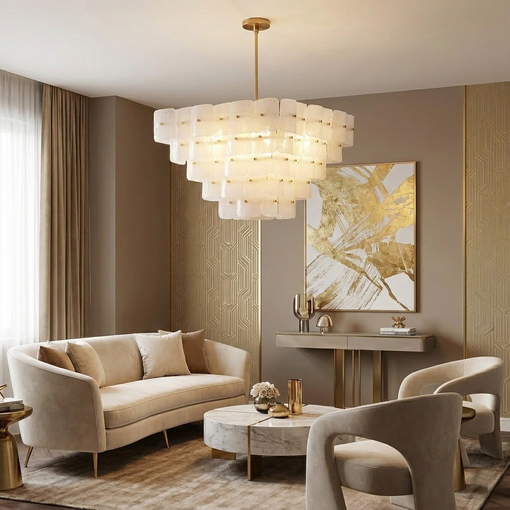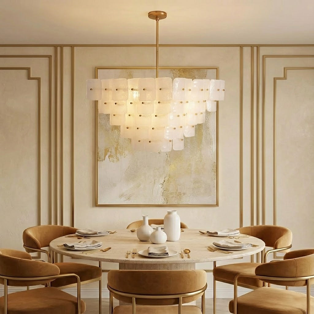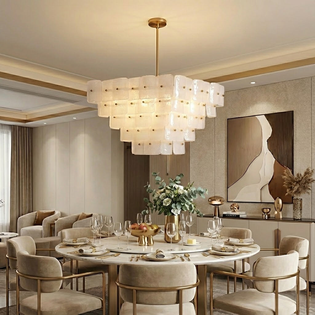 The Jacik Chandelier by dekorfine brings sculptural elegance and modern refinement into perfect harmony. Featuring layers of hand-formed glass tiles, each panel subtly textured and individually mounted on a warm brass frame, this chandelier evokes the artistry of classic Murano glass with a contemporary edge. Its cascading, stepped silhouette adds architectural depth while diffusing light through the frosted and glossy glass for a soft, atmospheric glow.