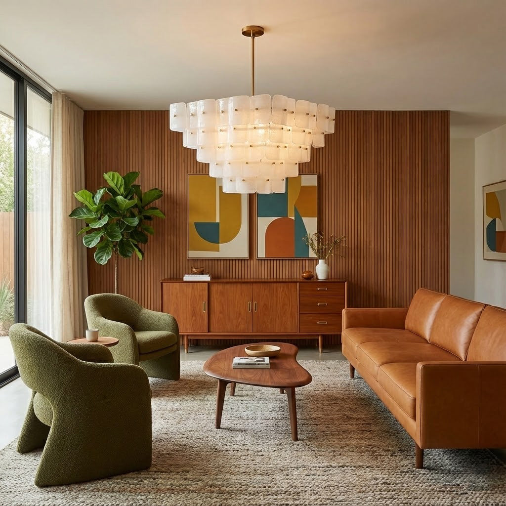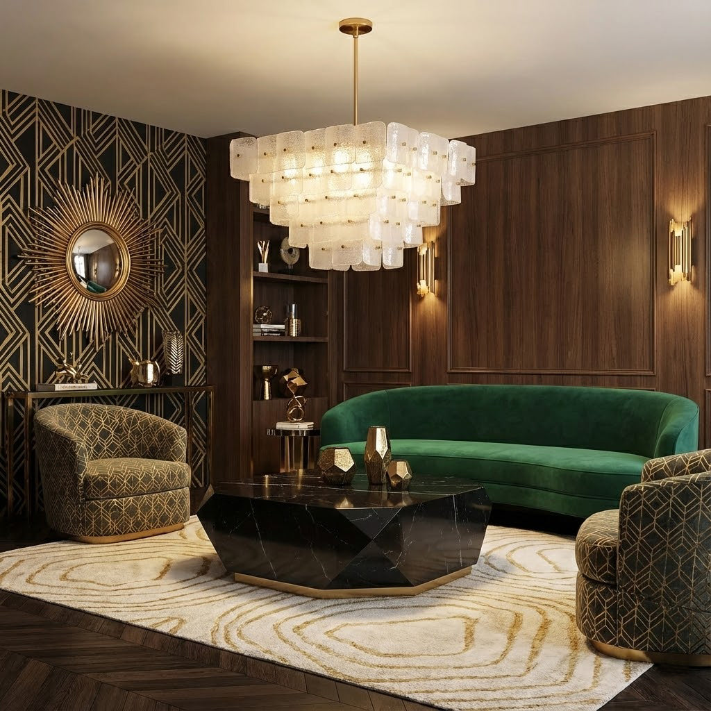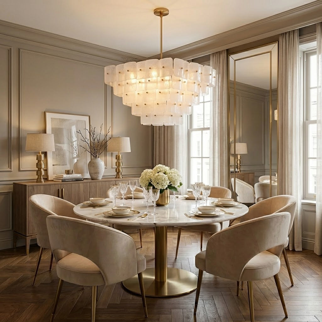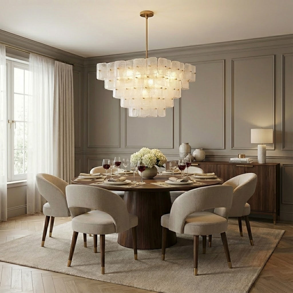 The Jacik Chandelier by dekorfine brings sculptural elegance and modern refinement into perfect harmony. Featuring layers of hand-formed glass tiles, each panel subtly textured and individually mounted on a warm brass frame, this chandelier evokes the artistry of classic Murano glass with a contemporary edge. Its cascading, stepped silhouette adds architectural depth while diffusing light through the frosted and glossy glass for a soft, atmospheric glow.