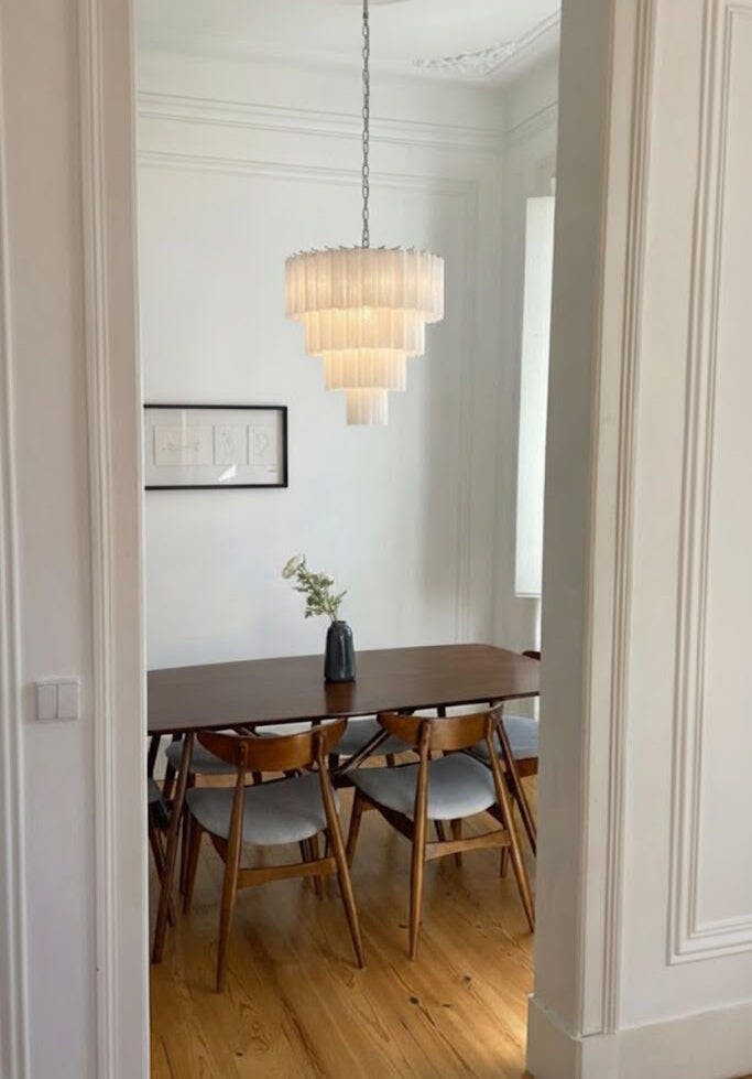 Élégant et imposant, le lustre en verre Maribel de Dekorfine apporte une touche sculpturale à n'importe quelle pièce. Fabriqué à la main en verre d'inspiration Murano dans une douce teinte rouge, chaque rangée d'éléments tubulaires ondulés diffuse une cascade de lumière, créant une profondeur et une texture fascinantes. Sa structure métallique offre un support robuste et une touche luxueuse, ce qui en fait une pièce maîtresse remarquable dans les salles à manger, les cages d'escalier ou les halls d'entrée majestueux.