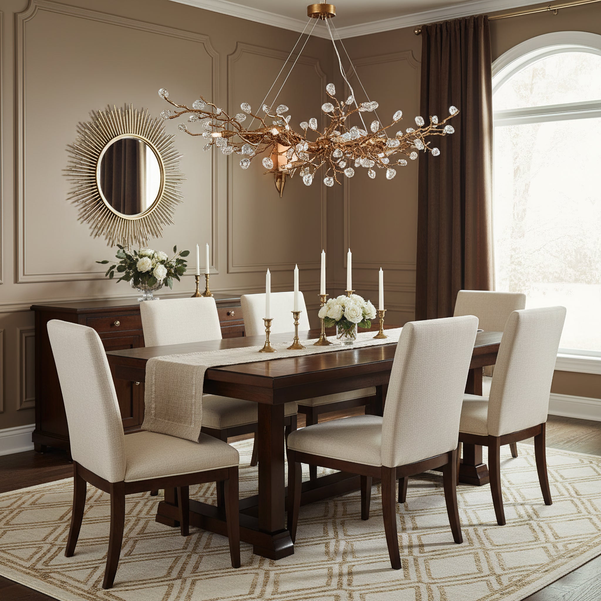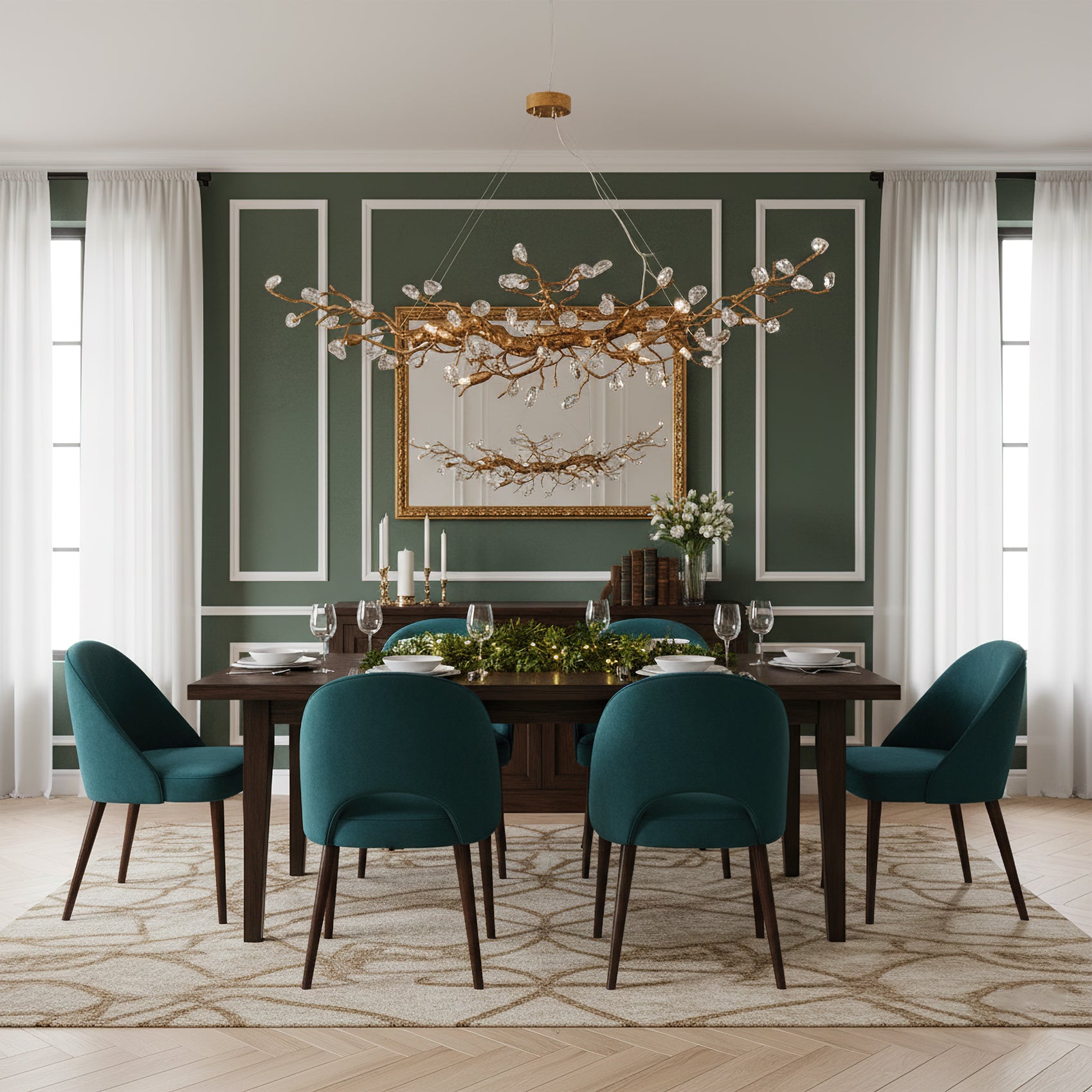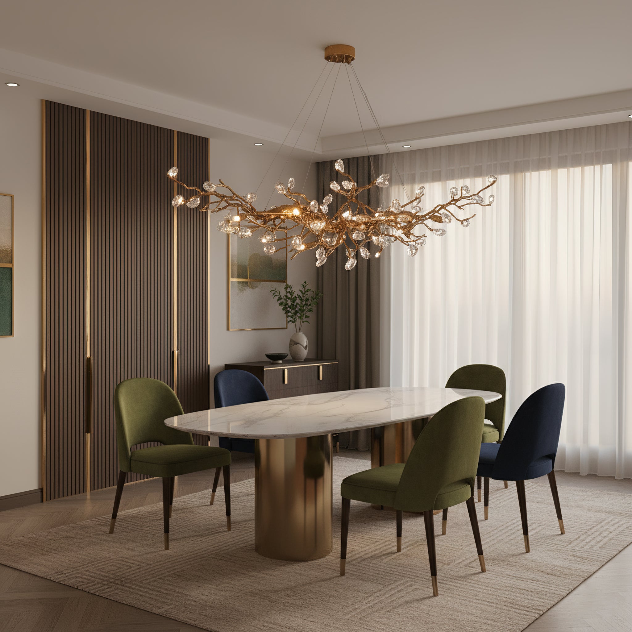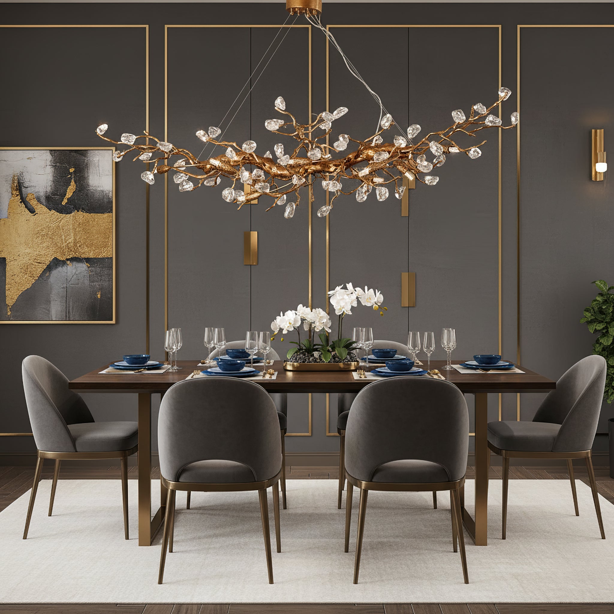 The Bloom Branch Chandelier from Dekorfine is a stunning piece crafted from brass and adorned with glass elements. Featuring an antique bronze finish. Perfect for adding a touch of elegance and nature-inspired beauty to any space.