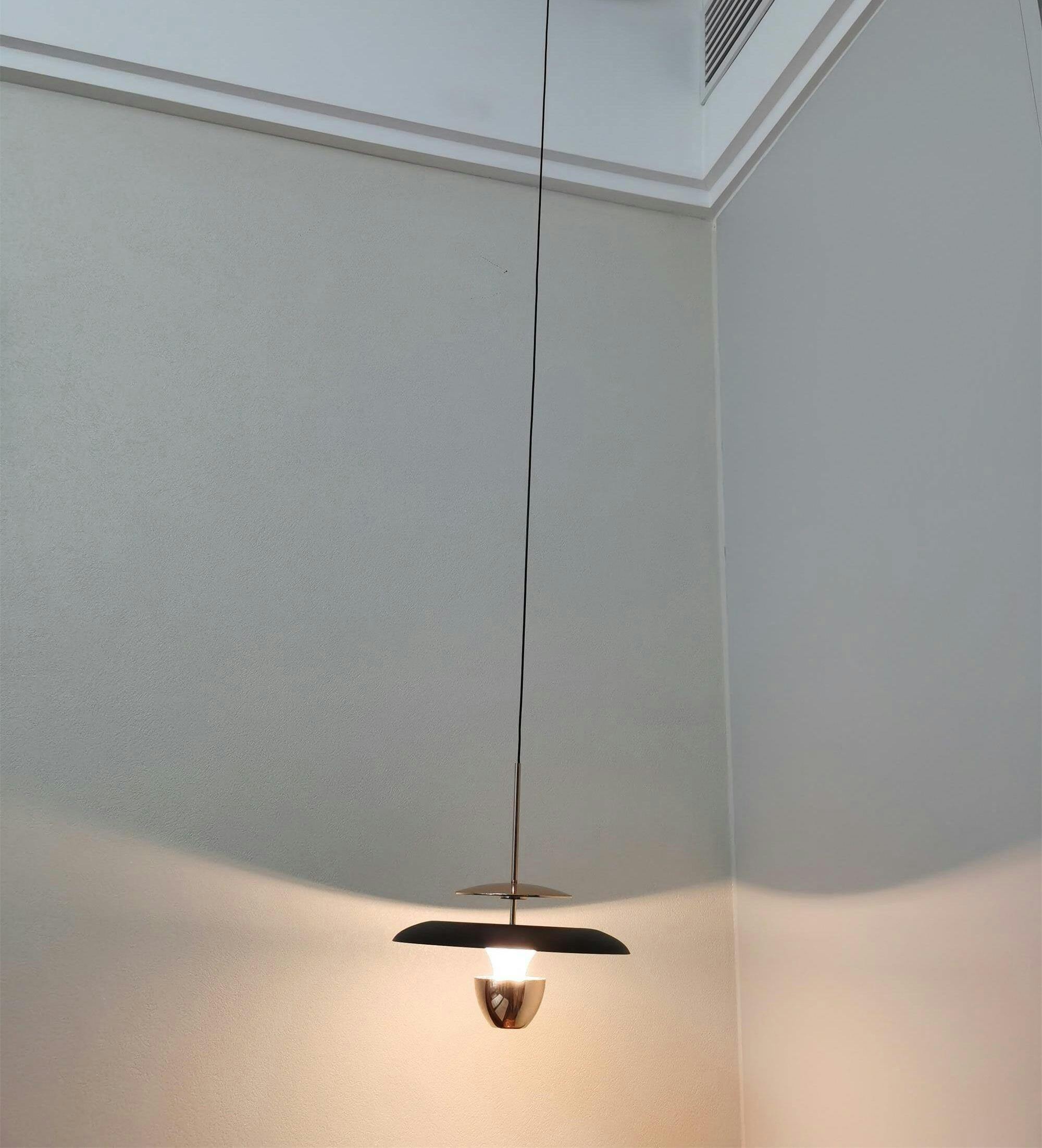 Versier je ruimte met een schone en warme laag licht. Nu verkrijgbaar met een gladde metalen constructie, het bestaat uit een brede, sierlijk gebogen kap die op het uiteinde van een slank snoer rust. Direct onder de kap ligt een halfkoepelvormige diffuser met daarin de geïntegreerde LED die een heldere en gerichte gloed uitstraalt. De kap valt als een waterval door de kamer en creëert een warme, niet-verblindende laag licht.